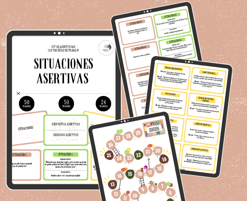 Estas tarjetas están diseñadas para ayudarte a practicar la asertividad en diversas situaciones. Cada tarjeta contiene una situación, una respuesta asertiva y el derecho asertivo correspondiente, proporcionando un contexto completo para el ejercicio.